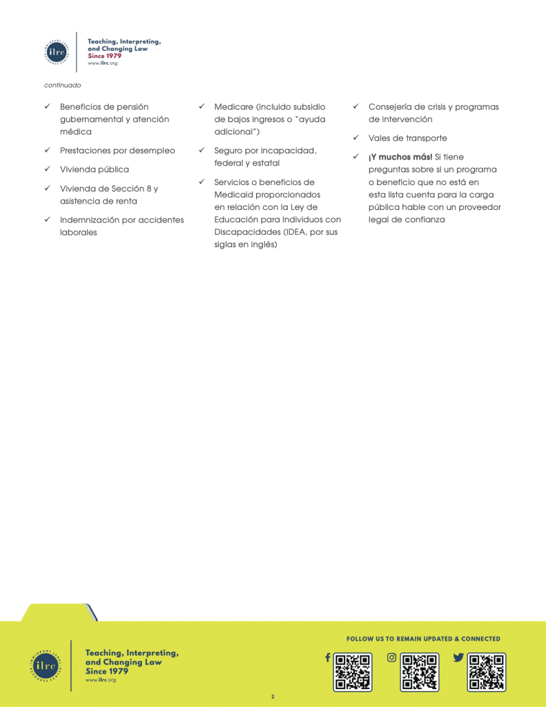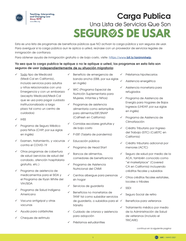 La Red de Recursos Legales para Inmigrantes tiene una hoja informativa y otros recursos sobre las reglas de la carga pública, disponibles en inglés, español y chino. Eso incluye una lista de “uso seguro” que puedes ver a continuación.